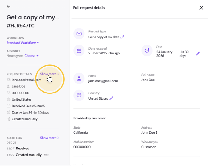 Review Enriched Data: Evaluate additional context provided via your Privacy Center web form, including the user's Country of Residence, mobile number, or other custom data fields defined in your Privacy Center Settings.