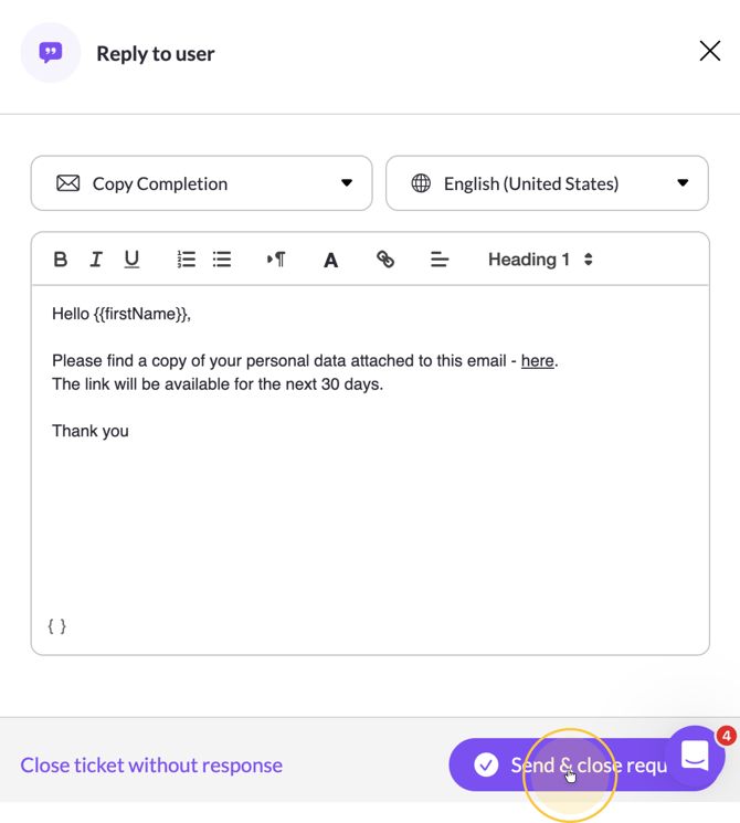 Finalize the request by clicking "Reply to user" and selecting a predefined template to automatically share the secure data link.