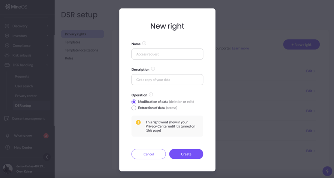 Navigate to the ‘DSR setup’ page to see which privacy rights are available in your Privacy Center.