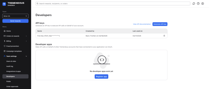 Click Generate API Key at the top right. - Make a note of the API key. You will need it to configure MineOS integration.