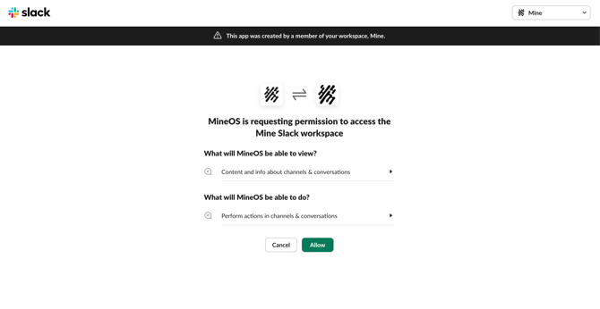 - Authorize MineOS connection to your Slack workspace by clicking "Connect" and following the onscreen instructions: