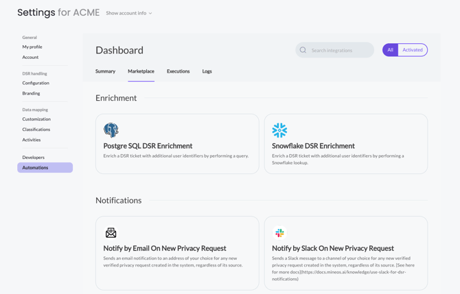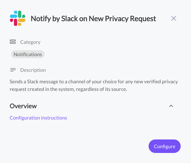 - Pick the "Notify by Slack on New Privacy Request" integration and click Configure.